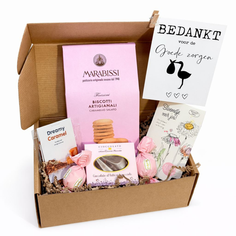 In ons assortiment vind je verloskundige bedankjes die je individueel kan geven. Maar ook bedankjes die aan het gehele team gegeven kunnen worden. Deze kan in de koffiekamer gezet worden en zo kunnen ze tijdens de overdracht er samen van genieten. Geschikte cadeaus hiervoor zijn bijvoorbeeld ons verloskundige bedankt koffie, tasje gevuld met thee en lekkers of het doosje gevuld met heerlijke roze of blauwe chocolade ballen.